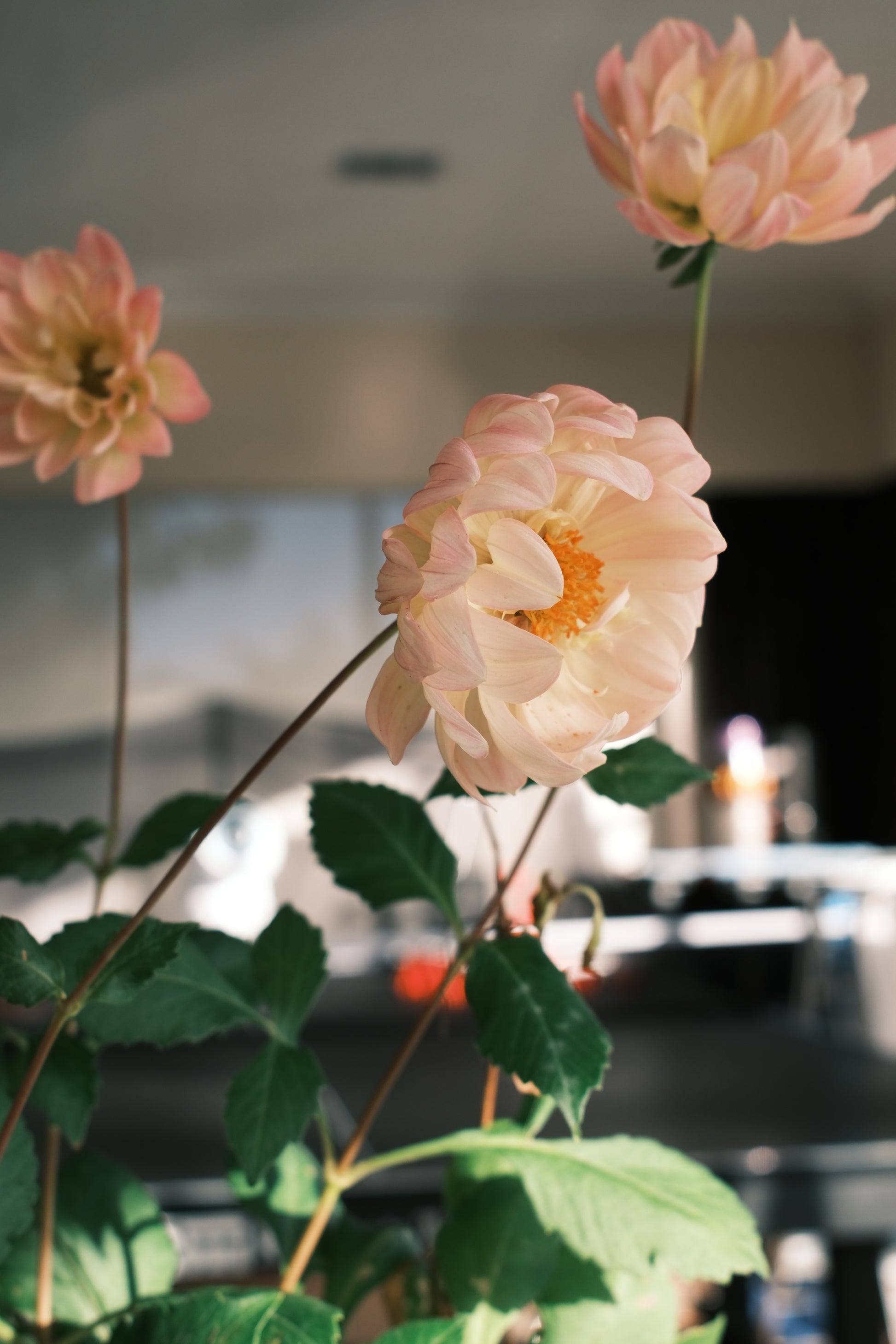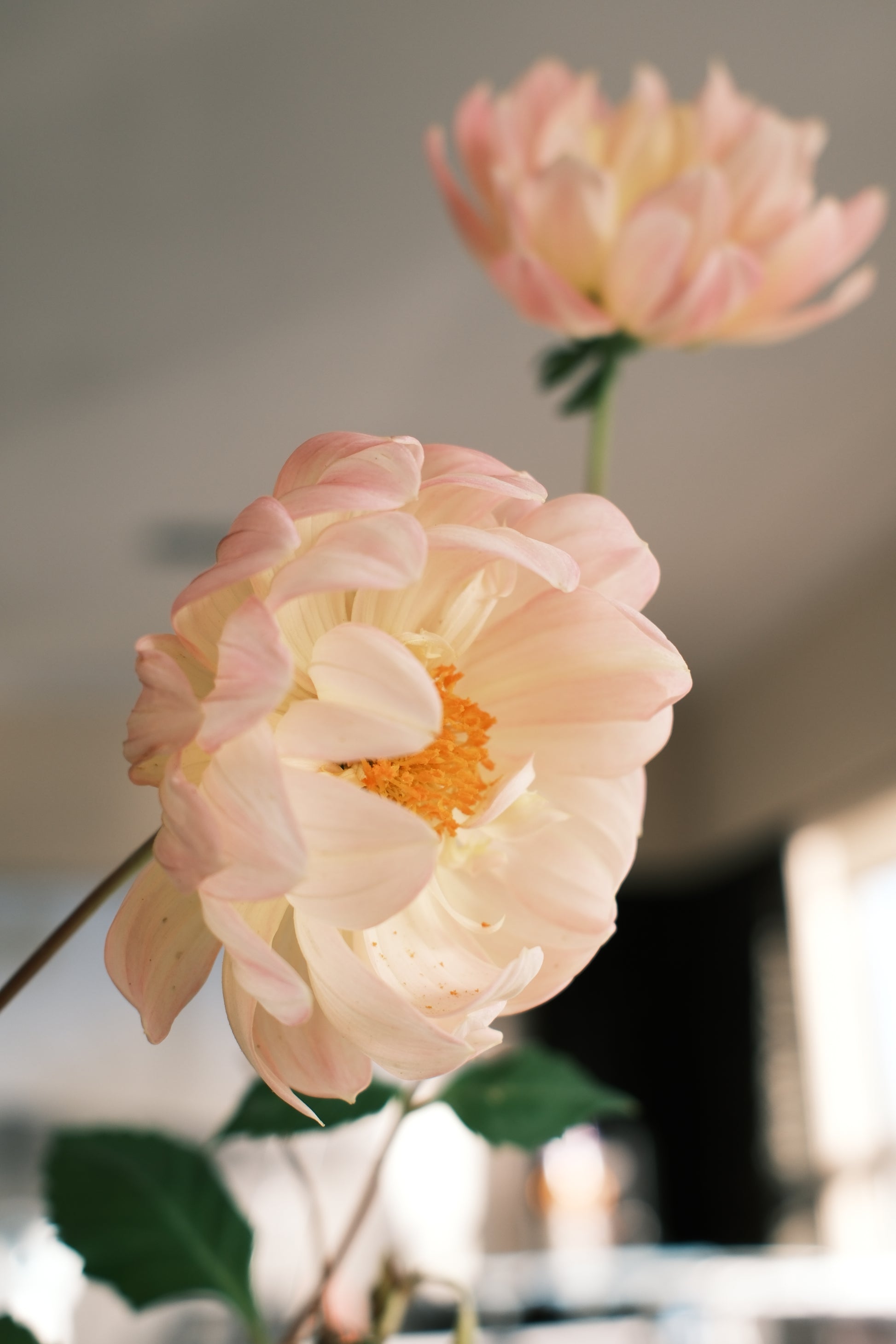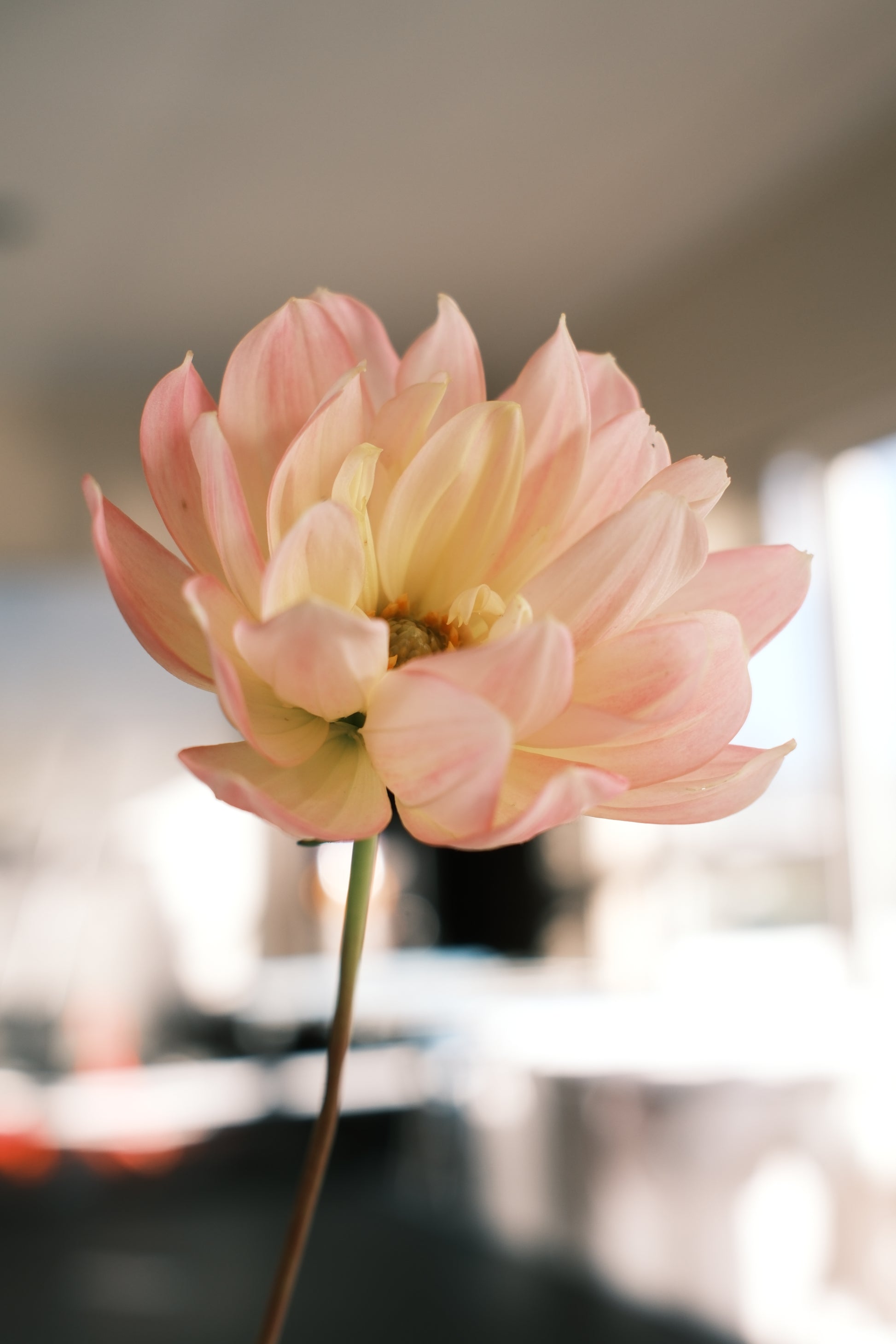 A beautiful peony like flower with soft pink tones and a hint of yellow.